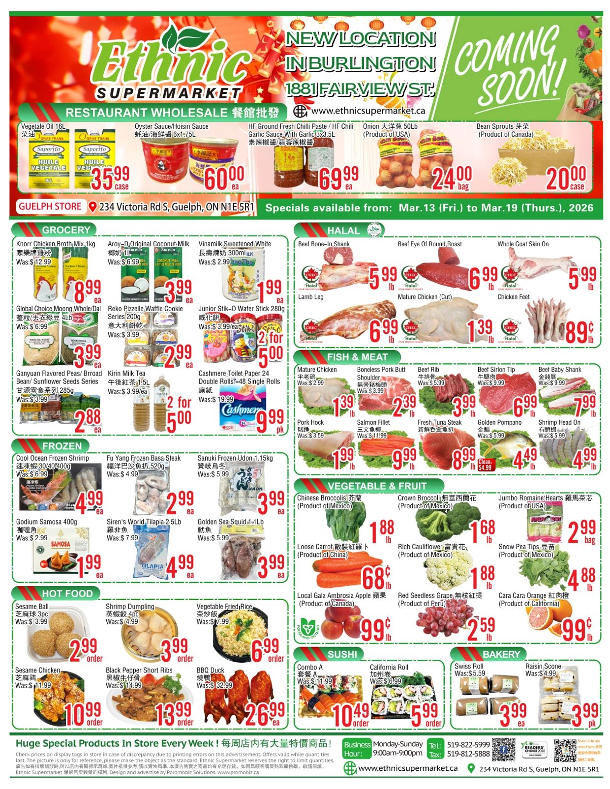 Ethnic Supermarket has over 50,000 sq. ft. service space with a large parking lot located in Guelph. We carry a wide variety of multicultural foods, grocery items and prepared foods. There are more than 30,000 different products in our store including Asian, Indian, North and South American, Middle Eastern, and European foods. The store’s departments include: Produce, Meat, Halal Meat, Seafood, Frozen, Dairy, Bakery, Groceries and Food Court. We will do our best to serve the community and introduce ethnic foods and culture to the local community.